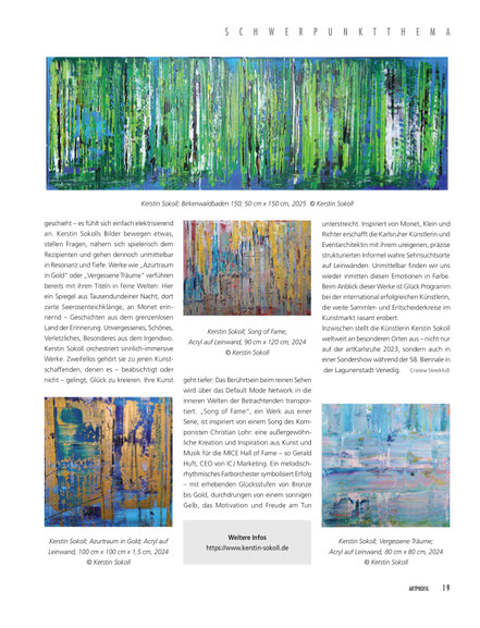 Kerstin Sokoll malt Emotionen – roh, intensiv und scheinbar vollkommen abstrakt. Ihre meist großformatigen Acrylgemälde sind farbgewaltige Momentaufnahmen, die sich durch expressives Kalkül und technische Präzision auszeichnen und dabei oft subtil Brücken zur realen Welt schlagen. Dabei verzichtet sie ganz bewusst auf gezielte Gegenständlichkeit und erschafft in einem strukturierten Informel visuell wie haptisch lebendige Oberflächen, die oft erst mit dem Titel ihre eigentliche Intention offenbaren. Inspiriert von Monet, Klein und Richter fand sie nach einer Karriere als Eventgestalterin autodidaktisch zur Kunst und entwickelte rasch eine eigene Handschrift. Ihr Werk bewegt sich zwischen spontaner Farbexplosion und kontrolliertem Schaffensprozess – stets mit dem Ziel, emotionale Einzigartigkeit sichtbar zu machen. Seit 2018 erfährt sie internationale Anerkennung, u. a. durch Auszeichnungen der Light Space & Time Art Gallery und Ausstellungsbeteiligungen während der 58. Biennale in Venedig. Sokoll versteht Malerei als Performance und nutzt neben Pinseln auch Rakel und Spachtel, um farbintensive Werke von kraftvoller Tiefe zu schaffen.